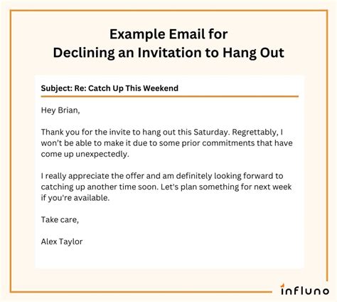 Express appreciation for the invitation, mentioning specifically what you were invited to do in a specific event on a specific day. Here are some tips on how to decline an invitation without hurting feelings: Master the art of rejection with confidence and tact. Politely decline a meeting invitation;.